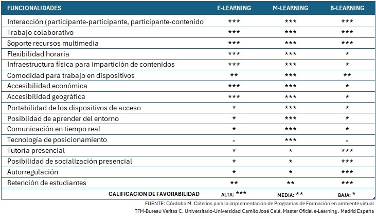 La tabla 1 muestra las ventajas comparativas de cada una de las modalidades de formación en ambiente virtual respecto de la eficiencia de las prestaciones o funcionalidades que tienen incidencia en la interacción efectiva entre participantes y participante contenido, como condición de un aprendizaje de calidad.